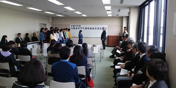 本日、9時30分から矢板市生涯学習館で「矢板市中学生海外派遣出発式」が行われました。「出発式」には、市長さんを始め、多くの来賓の方が見え、激励の言葉をかけてくれました。実行委員長(団長)の村上教育長さんや市長さんのあいさつは、英語から始まり海外派遣を実感しました。齊藤市長さんからの激励の言葉では、各学校の代表ばかりでなく矢板市の代表として、自覚と誇りを持って充実した研修になることを期待していました。