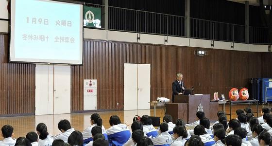 寒くなることを予想して、全校集会「冬休み明け集会」は午後に行うことにしておりましたが、今日は東日本や北日本は日中の気温が3月から4月並みになるという予報が出ており、比較的暖かな体育館で集会を行うことができました。