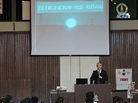 まず、学校長から「明けまして おめでとうございます」の新年の挨拶から始まり、本校屋上から望む“初日の出”を紹介するとともに、御来光が校舎に反射してキラリと光る矢板中を写し、輝く矢板中を目指してほしい旨の話をしました。そして、今年の干支の「戌年」にまつわる話と、「1年の計は元旦にあり」という言葉を紹介するとともに、“吉田松陰”の名言や“相田みつを”の言葉を引用しながら、年の初めの目標や願い・希望をもつことの大切さと、目標に向けての努力を大切にしたいことについて話しました。