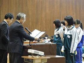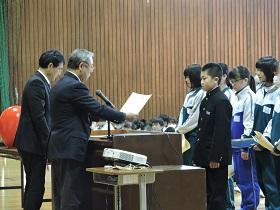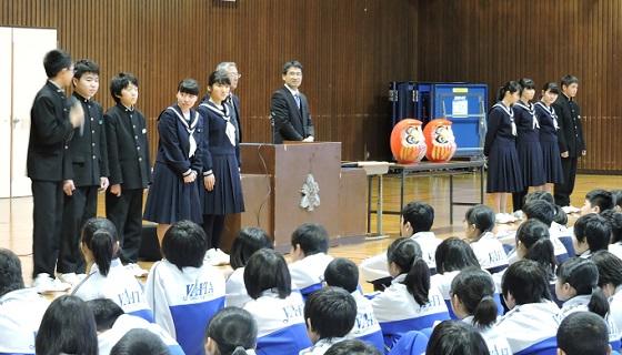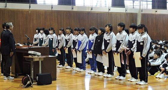 続いて、冬休み前集会で伝達できなかった、各種大会・コンクールなどの賞状の伝達を行いました。今回も多くの表彰状の伝達を行い、全校生で栄誉を讃えました。