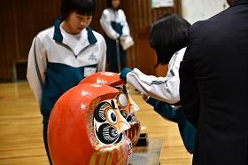 冬休み明け集会の最後には、恒例となっている「だるまの目入れ式」が行われました。50㎝程の“だるま”に、生徒の交通安全と必勝・健康の願いを込め、昨年のだるまには両目を、今年のだるまには左目を入れました。交通委員会の委員長が代表でだるまに願いを託しましたが、生徒一人一人の意識が交通安全や部活動での必勝・健康につながる基ですので、心がけていってほしいものです。