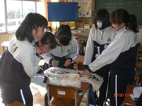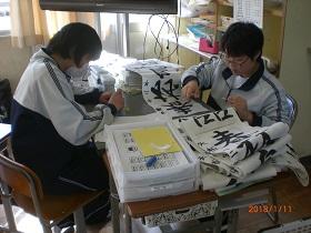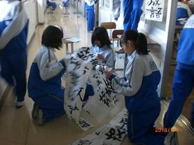 例年この時期、冬休みの課題として取り組んでいる地区書初展の作品を校内に掲示し、生徒同士の作品を鑑賞し合い、書写への関心・意欲を高めることを目的に校内書初展が開催されます。各教室の廊下には、学芸委員と国語係が作品をつなぎ合わせ丁寧に展示してくれました。