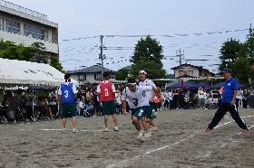 競技の直前、にわか雨が降ってきたために、まりが湿ってしまい投げ上げることが大変そうでした。また、カゴを支える係の生徒もまりと一緒に落ちてくる濡れた砂粒には、苦労している様子でした。