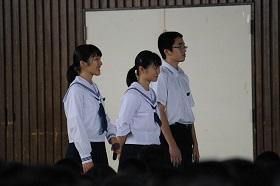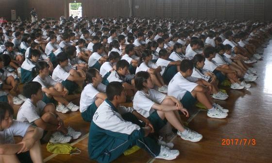 体育館は、かなり湿度が高く蒸し暑い状態でしたが、全校生は真剣な表情で派遣団員の発表を興味を持って聞いていました。