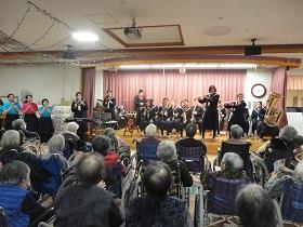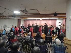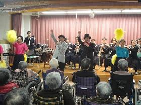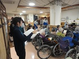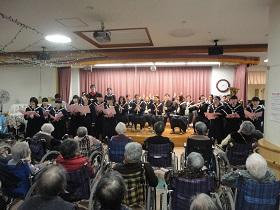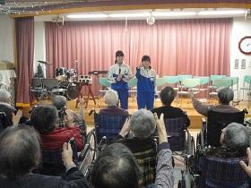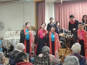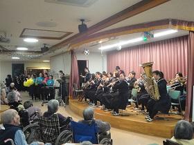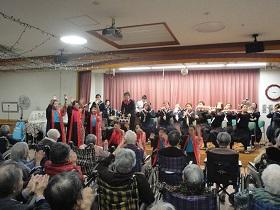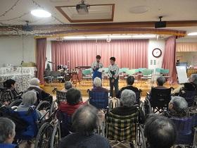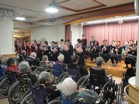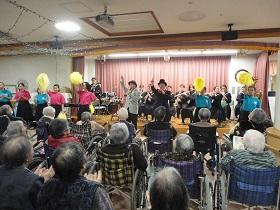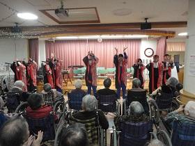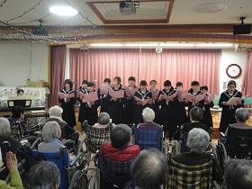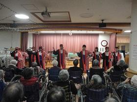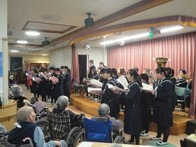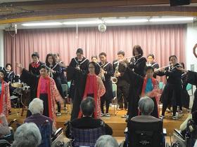12月17日(土)、年末の恒例となっている生徒会福祉委員会と吹奏楽部、合唱部による「八汐苑」への訪問ボランティアを行いました。通所、入所しているおじいさんやおばあさんたちが、福祉委員との“じゃんけんゲーム”に参加したり、“よさこいソーラン”や合唱部・吹奏楽部の演奏では、手拍子をしたりしながら笑顔で聴いてくれていました。曲目は、おじいさんやおばあさんたちが聴いて楽しめるように、心和む唱歌・童謡が中心でしたが、「上を向いて歩こう」の演奏では、一緒に口ずさむ姿も見られました。最後の吹奏楽部の演奏では、北島三郎の「祭り」が演奏され、会場は盛り上がりを見せていました。