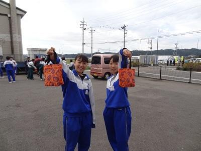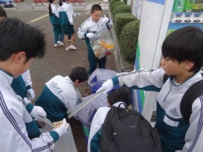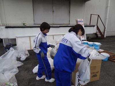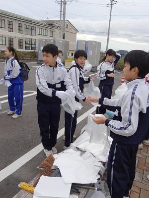 生徒会長からゴミ袋を配ってもらっています