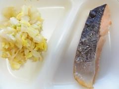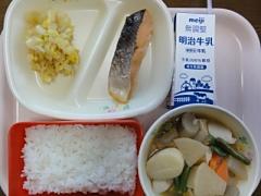 <食育コーナー「今日の献立」> ご飯、牛乳、鮭の塩焼き、白菜とたくあんの和え物、野菜の含め煮でした。 「野菜の含め煮」って、何かな?と思っていましたが、我が家で食べる煮物と同じことが分かりました。「含め煮」は普通、野菜に鶏肉の中に、「高野豆腐」が入るようですが・・・。
