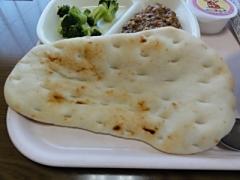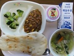 <食育コーナー「今日の献立」> ナン(1枚)、牛乳、キーマカレー、ゆでブロッコリー、野菜スープ、とちまる君いちごムースでした。 少し辛めのキーマカレーにナンをつけて、いただきました。 久しぶりにナンを食べたような気がして得した感じです。