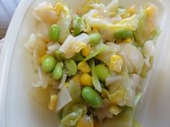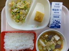 <食育コーナー「今日の献立」> ご飯、牛乳、ともなりくん卵焼き、かんぴょうサラダ、けんちん汁でした。 厚焼き卵の表面に「ともなりくん」の絵が刻印(?)された卵焼きで、食べるのがもったいない(かわいそう)な感じでした。 野菜、具だくさんの「けんちん汁」あたたかくて、美味しい味付けでした。