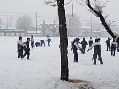 写真5枚・・・昼休みの生徒たちが遊ぶようすです。「雪」の降る中を矢中生たちは、半数以上が外に出て、「雪合戦」や「鬼ごっこ」、「ドッチボール」、「サッカー」などを校庭いっぱい広がって遊んでいます。雪や寒さに負けない矢中生です。