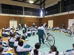 <交通安全教室(1年生対象)> 今日の3,4校時の2時間を使って、「交通安全教室」、特に自転車の安全な運転と整備を中心に、VTRと講話、後半は「自転車の乗り方テスト」を行いました。