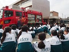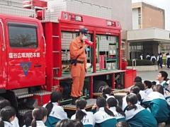 訓練終了後、サプライズで、1年生は「レスキュー(特殊工作車)車」の説明、見学をさせていただきました。1年生たちは、とても興味深く、「働く自動車」の話を聞いていました。