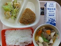 <食育コーナー「今日の献立」>ご飯、牛乳、ミルメークコーヒー、サンマのゆず風味煮、筑前煮、白菜の味噌汁でした。 「筑前煮」は大釜で大量の食材を炒めて作っているので、家で作るものより、ひと味ふた味も深い味わいの「筑前煮」でした。