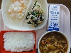 <食育コーナー「今日の献立」> ご飯、牛乳、ポークカレー、ポパイサラダ、フルーツのヨーグルト和えでした。 給食が再開されました。「おせち」や「外食」に飽きていた時で、私は久しぶりの矢中の給食の味を、嬉しく美味しく味わいながらいただきました。