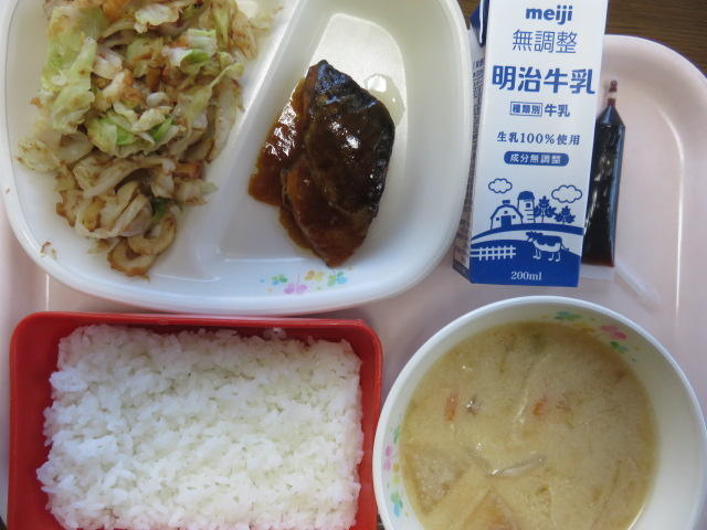 <食育コーナー「今日の献立」>ご飯、牛乳、さばのゆず味噌煮、キャベツとちくわの和え物、豆乳汁です。 「豆乳汁」は温かく、里芋などの野菜がたくさん入っていて美味しいお汁になっていました。