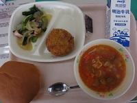 ***まめ知識「ミートソース」・・・日本では、「ミートソース」ですが、イタリアでは「ラグー・アッラ・ボロニェーゼ」と呼ばれています。タマネギやセロリなど刻んだ香味野菜と炒めたあわせ風味をつけたひき肉と、トマトを合わせたソースです。パスタの一つの「ヒェットチーネ」とあわせたり、「ラザニア」や「カネロニ」に調理したりします。 参考文献「給食ガイド」(H27,12,10)伊藤敦子栄養教諭の資料から引用
