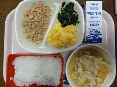 <食育コーナー「今日の献立」>ご飯、三色丼の具(とりそぼろ、ほうれん草、炒り卵)、根菜ごま汁でした。 「三色丼」は私には何となく懐かしい味で、幼少期、母親が作ってくれたお弁当を思い出します。