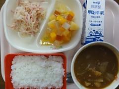<食育コーナー「今日の献立」>ご飯、ポークカレー、大根サラダ、カクテルゼリー(デザート)でした。久しぶりにカレーが食べられるあって、私は朝から嬉しく出勤しました。矢中の「ポークカレー」は豚肉をはじめ野菜具だくさんで、ちょっとスパイスのきいたカレーでした。