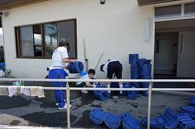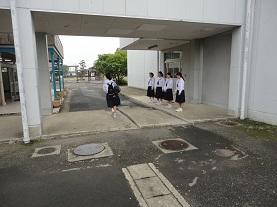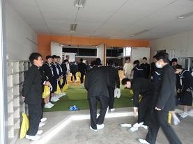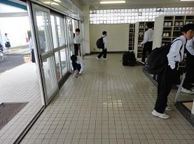 更に、あいさつ運動のメンバーが気を利かせて、転倒防止に昇降口のタイルの水切りを進んで行っていました。