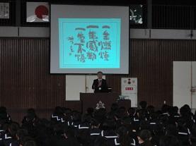学校長の話では、錦織圭の座右の銘「一生燃焼 一生感動 一生不悟」を取り上げ、「ことばの力」について紹介するとともに、相田みつを氏の代表的な詩や“ことば”をいくつか取り上げ、心に止まった詩や“ことば”を自分の心の支えとして探してみてはどうかということで、図書室にある本校蔵書を紹介しました。