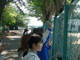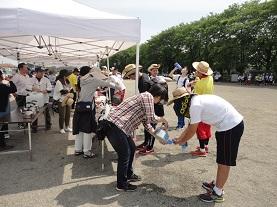 例年、矢板中(14.5㎞ポイント)では第2グランドを休憩所として貸し出しておりますが、元気な「こんにちは!」のあいさつとともに到着し、内川沿いの桜の木陰で、暫しの休憩を取っていました。休憩所でのテントでは、熱中症対策でしょうか保護者会の協力で冷水が提供され、ペットボトルや水筒に補給する生徒が大勢みられました。