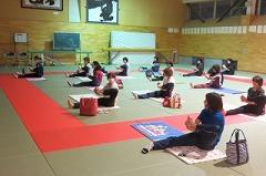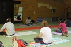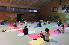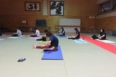 <PTAコーナー「教養講座ヨガ教室」> 2日(金)17時30分から本校格技場で、PTA教養部の教養講座が開かれました。25名の参加で、講師の木村 賢子先生の指導のもと、約1時間の「ヨガ」の実習をしました。