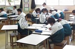 <1日、遅れで期末テスト 実施> 1日遅れましたが、5教科の「期末テスト」を実施しました。写真(3年のテストのようす)のとおり、真剣に問題に立ち向かっている姿が見られました。