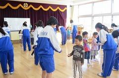 〇副園長さんから、幼稚園の説明や諸注意等のお話をいただき、園児との「遊び活動」を行いました。写真のとおり、6組の生徒たちは園児と笑顔で弟や妹のように、やさしく関わることができたようです。