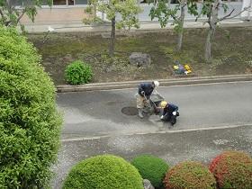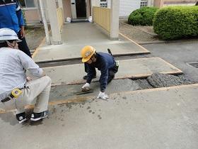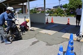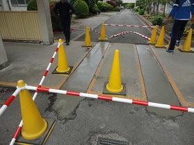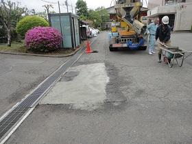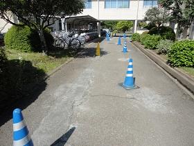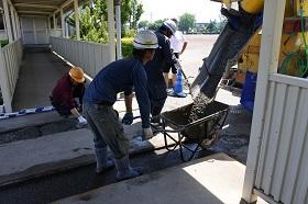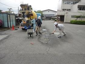 また、工事業者さんのご配慮により、前回・今回と余ったコンクリートを提供いただき、中庭や通路のくぼみや段差部分の補修を行っていただきました。特に、校庭に抜ける通路の段差も改善されたので、乗用車の通り抜けも心配なく通行できるものと思います。