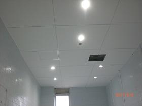 また、同時に天井部分の電気設備工事も進められており、自動点灯のLEDライトが眩しいくらいに輝いていました。今までのトイレとは、比較できないほどの明るいトイレになりそうです。