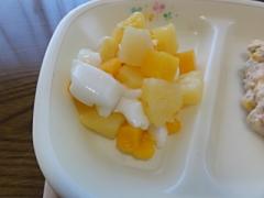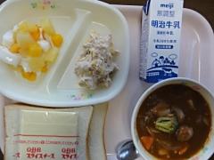 <食育コーナー「今日の献立」> セルフツナサンド(食パン2枚、ツナサラダ)、牛乳、ミートボールのトマトシチュー、フルーツ杏仁でした。 「ミートボール」が入ったシチューは、なかなかご家庭では作らないと思います(我が家を考えると)。ミートボールの食感がよく、楽しくいただけるシチューでした。