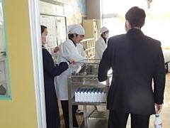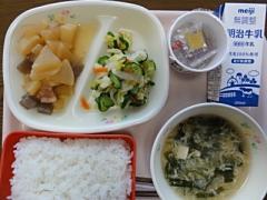 <食育コーナー「今日の献立」> ご飯、牛乳、納豆、豚肉と大根の煮物、キュウリとキャベツの即席漬け、にら玉汁でした。 和風のおかず3品+お汁でした。「煮物」は大根に豚肉のエキスが加わり味がしみていて美味しくできていました。