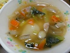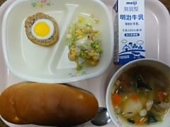 <食育コーナー「今日の献立」> アップルパン、牛乳、スコッチエッグ、ナッツサラダ、すいとん汁でした。 久しぶりにいただいた「すいとん汁」でした。今日のすいとんは佐野の「耳うどん」のような形をしていて、うどん感覚でいただきました。