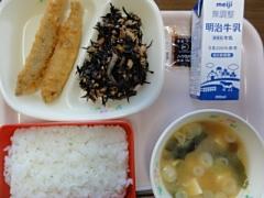 <食育コーナー「今日の献立」> ご飯、牛乳、ししゃもフライ(2本)、ひじきと大豆の煮物、豆腐とワカメ、なめこの味噌汁でした。 久しぶりに「ひじきの煮物」をいただきました。私の年代は、「ひじき」や「切り干し大根」などの煮物を時々、食べたいと感じます。 ただし、今の中学世代は「食べず嫌い」もあるのか、けっこう食べずに残す子もが多いです。