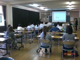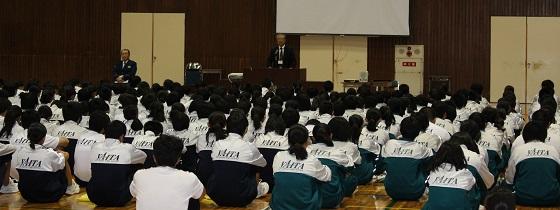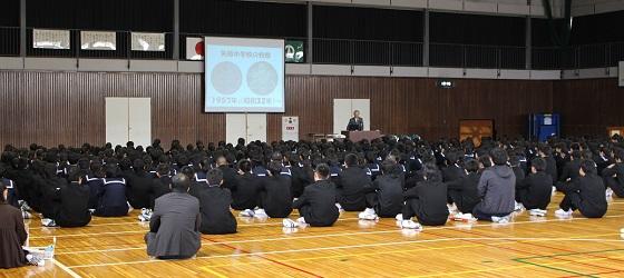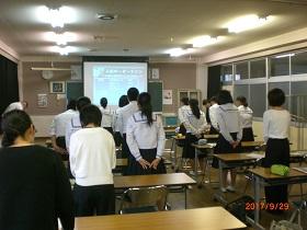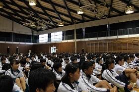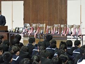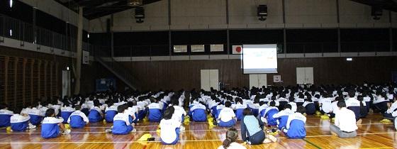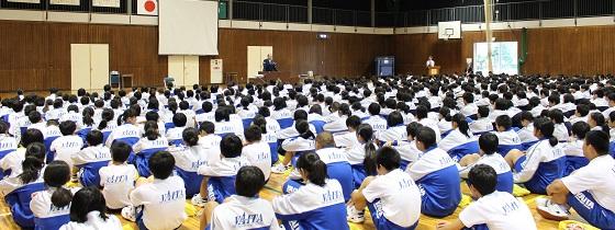 また、学習への取り組み方について、3年生の高校入試を考えさせ「受験は団体戦」か「個人戦」かについて考えさせ、日頃からの授業の積み重ねの大切さについて話し、「授業は団体戦!」「入試(試験)は個人戦!」と締めくくりました。
