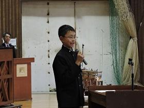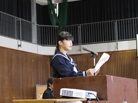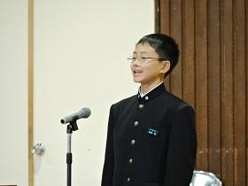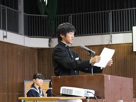 また、式に続いて「少年の主張発表塩谷地区大会」での主張発表を古市君に行ってもらいました。「Let’s greet」に込められた古市君の生徒会長としての思いが述べられました。