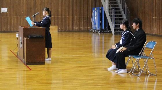 式の後、各学年の代表生徒3名による“2学期の抱負発表”を行いました。それぞれが、今までの自分を振り返り2学期に頑張りたいことを堂々と述べることができました。立派な発表に、全校生からも大きな拍手が贈られました。