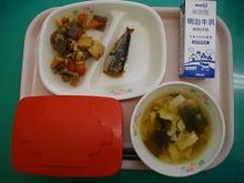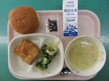 <食育コーナー「今日の献立」> 丸パン、牛乳、白身魚フライ、中濃ソース、ブロッコリーサラダ、コーンポタージュでした。 私は11時から12時50分まで、県立さくら清修高校の「課題研究発表会」の見学で外に出ていた関係で、今日も給食が食べられず、残念です。