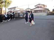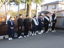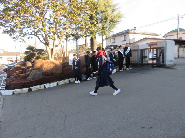 〇今日も登校時、校門のところで生徒会役員12名が、大きな声で「あいさつ運動」をしています。 登校してくる生徒たちも、生徒会役員の大きな声につられて(圧倒されて)、「おはようございます!」「おはようございます!」とあいさつをしています。 7時35分には、2名の1年生役員が校門に立っています。 手がかじかむ寒さなので、私から役員たちに、「手袋着用するように。」と指示しました。
