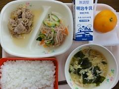 <給食コーナー「今日の献立」>今日の献立は、ご飯、牛乳、豚肉生姜炒め、春雨サラダ、卵スープ、冷凍みかんでした。 今日が1学期前半最終の給食でした。 「生姜炒め」で力(パワー)をつけて、子供たちは明日からの地区総体に臨んでくれるものと思います。 久し振りの「冷凍みかん」、歯にしみました!