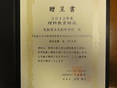 <第2回理科教育賞贈呈式に参列しました>今日は、朝、出勤し小川教頭と打合せをした後、JRを利用して横浜まで出張しました。 公益財団法人日産財団が幼・小・中学校を対象に子供たちの理科振興を祈念して「理科教育賞」を昨年度からはじめました。 2013年度助成校30校の一つに「矢板中学校」が選定されたことで、日産自動車グローバル本社 NISSANホールにて、私が贈呈書を受賞してまいりました。 第1部では、2011年度助成を受けた代表5校から成果発表会がありました。 本校も2年後、研究成果をまとめて代表の5校に選ばれれば、またこの会場でプレゼンを行うことになります。 70万円の助成金額をいただきますので、理科教材及び講師謝金等で 有効に活用しながら2年間、研究を推進していくよう、注視していこうと思います。この2年間の研究により、矢中生の理科への興味関心、意欲の向上はもとより、理科的な知識、理解、表現力のアップになることをおおいに期待しています。