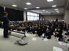 <交通安全教室(1年)>今日の2,3校時に「交通安全教室」を実施しました。 校庭に模擬道路を書いて実技演習を係は考えていましたが、生憎の「雨」で多目的室での講話形式になりました。 講師には矢板警察署交通課の小竹伸一係長と市役所から宮崎恵美さんが来校し、2時間にわたりお話をいただきました。「今年の1年生は私語もなく、真剣に話を聞いてくれますね。」と言って帰られました。 例年、「自転車通学」に馴れてきた5月に、大きな交通事故が起きています。 お家でも、毎日でもいいので、「自転車の乗り方」について、注意してあげてください。