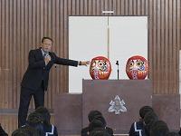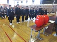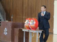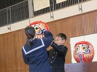 〇今日の全校集会では、最初に校長の話。そのあと、益田楽先生の着任式。新生徒会役員の「任命式」、交通安全を祈願にて、「ダルマの目入れ式」を行いました。