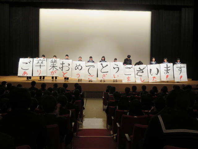 〇本日、13時10分から矢板市文化会館大ホールを会場に、生徒会主催の「謝恩・送別会」が行われました。 最初に、「矢板っ子輝き大賞」の表彰式を行いました。大森敏教育長から賞状をいただきました。 その後、「謝恩会」があり、職員には3年の館脇さんから「感謝のことば」があり、全員の職員に花束をいただきました。 「送別会」では、会長の内山さんから3年生に対して「送別のことば」があり、各学級に「花束」贈呈がありました。 送別のアトラクションでは、映画「ビリギャル」を約2時間鑑賞し、矢中に戻ってきました。