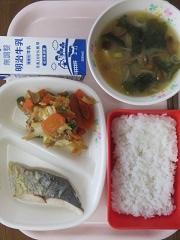 <食育コーナー「今日の献立」> 今日の献立は、ご飯、牛乳、シイラの塩焼き、肉野菜炒め、なめこ汁でした。 「シイラ」という魚は、給食で年に数回、出ていると思いますが、白身で身が硬く歯ごたえがあります。我が家では、なかなか食べられない食材です。