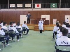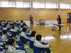 〇5校時、2年生は武道場に集まり、「修学旅行」について、業者からの説明をしていただきました。 最初に、奈良や京都の名所や旧跡を映したDVDを視聴し、そのあと業者の方から旅行の行程や京都の衣食住、建物、言葉について、クイズ形式でお話をいただきました。