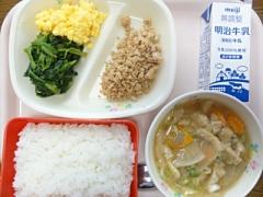 <給食コーナー「今日の献立」>ご飯、牛乳、三色丼の具(とりそぼろ、炒り卵、ほうれん草)、根菜胡麻汁でした。 我が家だけでしょうか? お家の朝食や夕飯で「三色丼」は作られますか? 家では、「三色丼」が食事のおかずに出たことはないように感じます。 私には楽しみにしている「メニュー」の一つです。