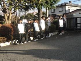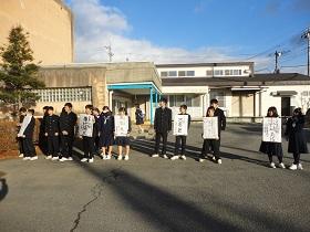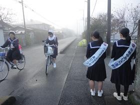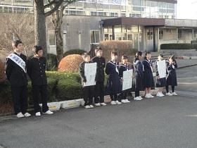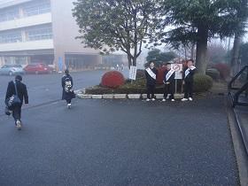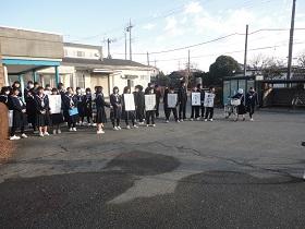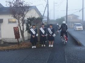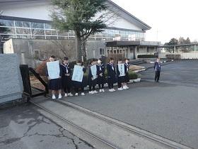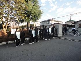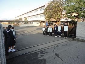 11月も残りわずかとなりました。今朝の“あいさつ運動”は、11月29日から12月2日の朝まで「生徒会役員選挙運動期間」に入ったため、いつものあいさつ運動メンバーの他に立候補者と応援者も加わり運動が行われました。