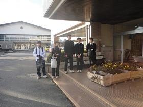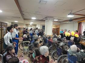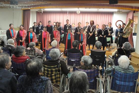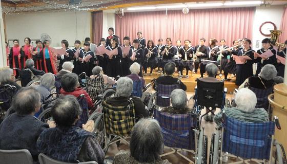 12月17日(土)、年末の恒例となっている生徒会福祉委員会と吹奏楽部、合唱部による「八汐苑」への訪問ボランティアを行いました。通所、入所しているおじいさんやおばあさんたちが、福祉委員との“じゃんけんゲーム”に参加したり、“よさこいソーラン”や合唱部・吹奏楽部の演奏では、手拍子をしたりしながら笑顔で聴いてくれていました。曲目は、おじいさんやおばあさんたちが聴いて楽しめるように、心和む唱歌・童謡が中心でしたが、「上を向いて歩こう」の演奏では、一緒に口ずさむ姿も見られました。最後の吹奏楽部の演奏では、北島三郎の「祭り」が演奏され、会場は盛り上がりを見せていました。