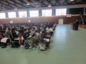 本日、3学年は“私立高校受験”の事前指導を行いました。学校長からの激励のことばの後、進路指導主事と学年主任から、受験に向けての説明を受けました。